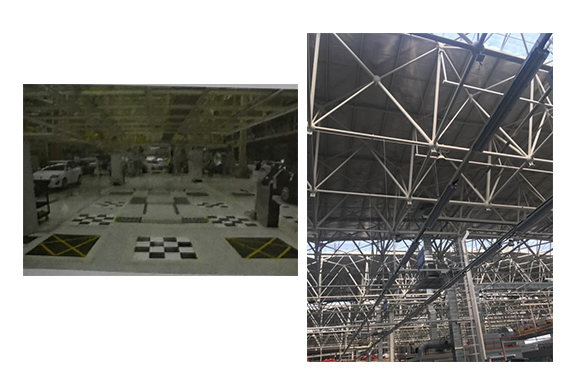 全景環視影像系統攝取車輛四周景物并通過控制器將四周景物合成一幅360°的全景圖,顯示效果類似從車輛上空俯拍的影像。全景影像拼接的精確程度將直接影響用戶的體驗。攝像頭和車輛在加工和組裝過程中,都可能與設計值產生偏差,這些偏差會導致全景影像的效果。全景環視影像系統的整車下線標定就是為了根據實際車輛進行標定以保證全景影像的效果。標定系統由標定主控系統,車輛擺正器,標定板,工藝照明設備組成。